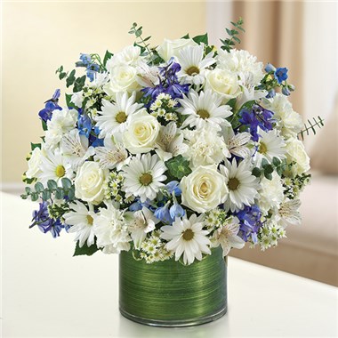 Blue is for sorrow, and white for the hope that inevitably overcomes it – this is a sentiment they will cherish. Our sympathy arrangement of white roses, alstroemeria, blue delphinium and carnations, elegantly designed by hand in a graceful cylinder vase, is a touching tribute to a life well lived and the hope that will always prevail. •Arrangement of white roses, alstroemeria, carnations, daisy poms and monte casino and blue delphinium; accented with fresh greenery •Hand-designed by our expert florists in a stylish clear glass cylinder vase lined with a Ti leaf ribbon; vase measures 6"H •Large arrangement measures approximately 16"H x 17"L •Medium arrangement measures approximately 15"H x 16"L •Small arrangement measures approximately 14"H X 15"L •A lovely gift for the service or for the home of family members or friends •Our florists hand-design each arrangement, so colors, varieties and vase may vary due to local availability •Alstroemeria may arrive in bud form and will open to full beauty over the next 2-3 days