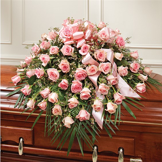 The ultimate symbol of grace, love and admiration, soft pink roses are a sentimental way to honor someone who was deeply cherished. Our half casket cover, crafted with care and artistry by our expert florists with over 50 of these soft-hued blooms and accented with a pink satin ribbon, is an unforgettable way to commemorate a lifetime of unconditional love.